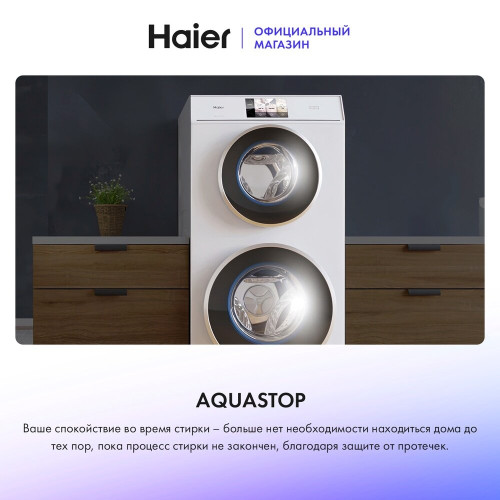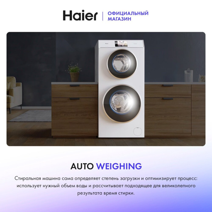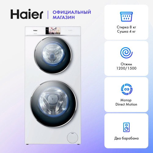 кипячение, постельное бельё, полотенца, объёмные вещи, рубашки, занавески, цветные ткани, освежающий цикл, своя программа, самоочистка; дисплей FULL Touch; барабан с подсветкой Pillow Drum; нижний барабан: загрузка 8 кг (стирка), 4 кг (сушка), скорость отжима 1500 об/мин, количество программ 20, объем барабана 54 л; верхний барабан: загрузка 4 кг, скорость отжима 1200 об/мин, количество программ 12, объем барабана 26 л; потребление энергии для мойки, вращения и сушки 8,14 кВтч / полный рабочий цикл; управление со смартфона: wi-fi, приложение для управления Haier U+