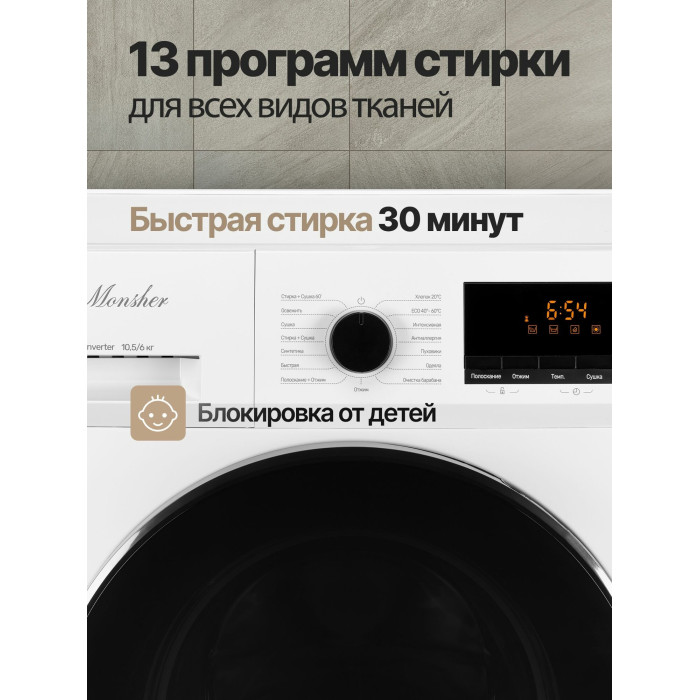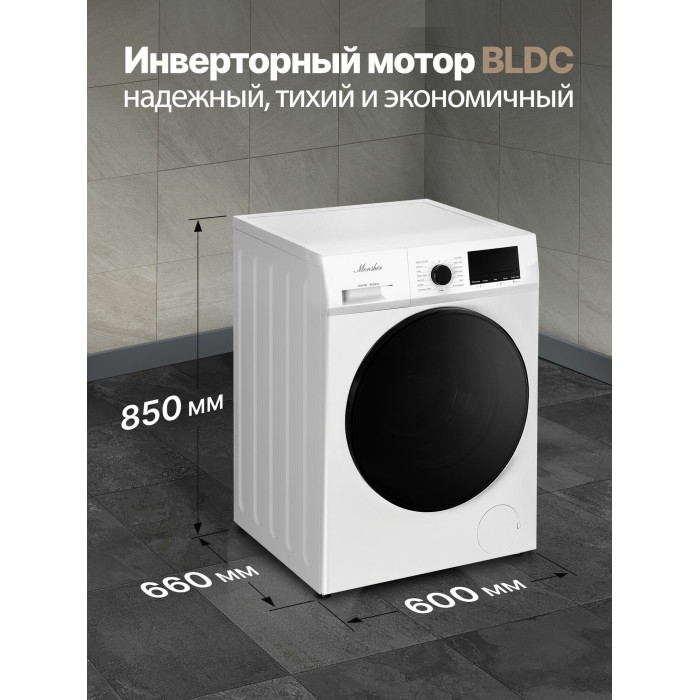 Стиральная машина Monsher MWDM 665, с сушкой, инверторный двигатель, 10 кг, белая