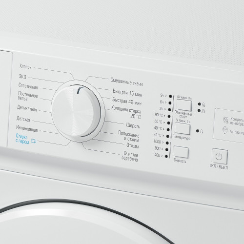 выбор скорости отжима, выбор температуры стирки, контроль баланса, отложенный старт, очистка барабана, сигнал окончания стирки, установка времени завершения стирки