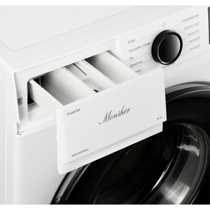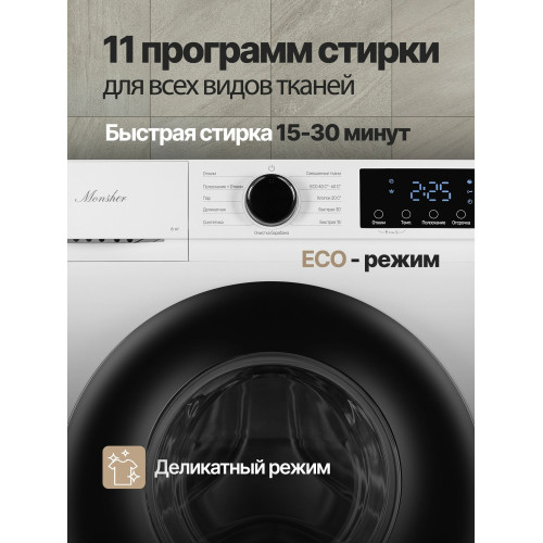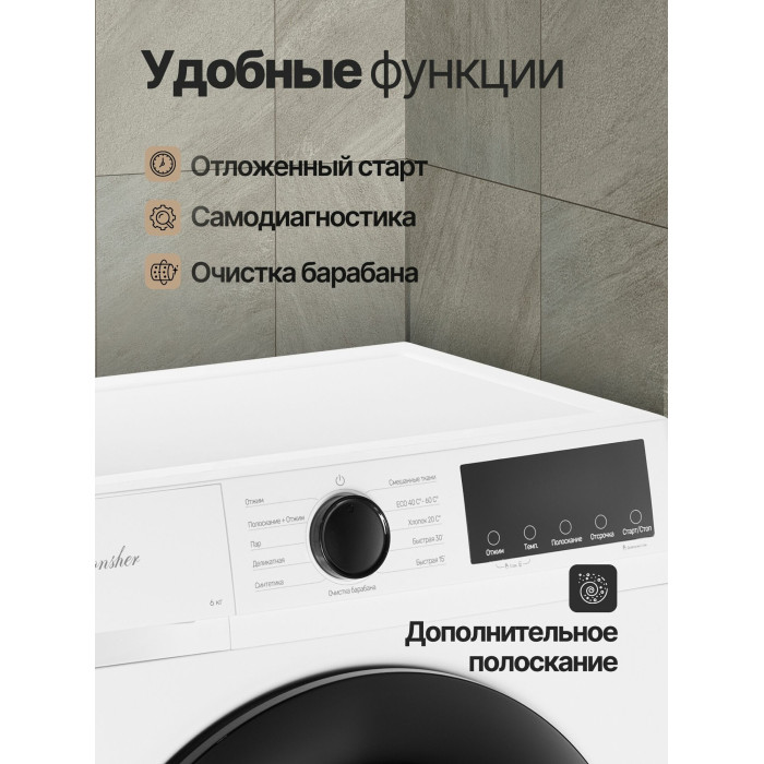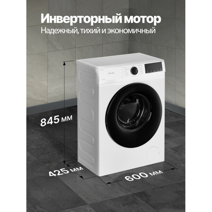 Длина сетевого шнура 150 см, Датчик определения загрузки, Инверторный двигатель, Диаметр люка 500 мм, иаметр загрузочного люка 290 мм ,барабан 42 л, Самодиагностика , Дополнительное полоскание
