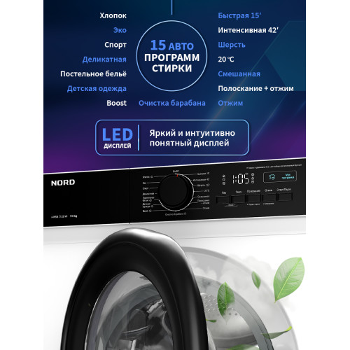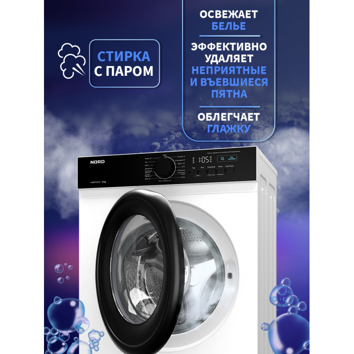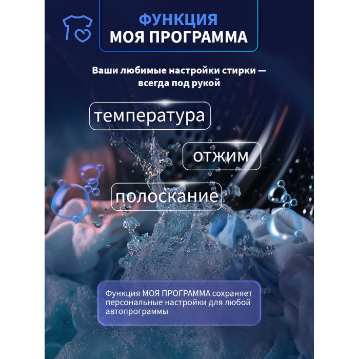 выбор скорости отжима, выбор температуры стирки, контроль баланса, контроль за уровнем пены, отложенный старт, очистка барабана, сигнал окончания стирки