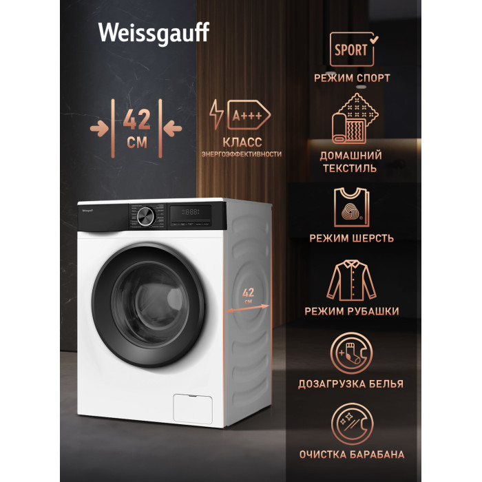 выбор скорости отжима, выбор температуры стирки, отложенный старт, очистка барабана, сигнал окончания стирки