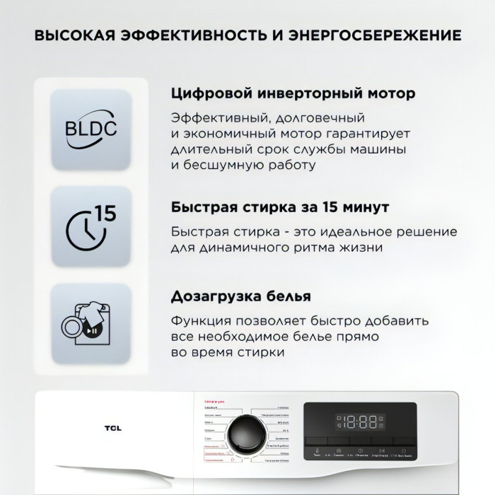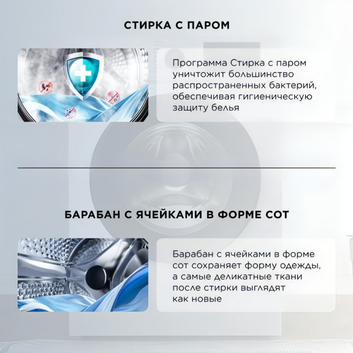 выбор скорости отжима, контроль баланса, контроль за уровнем пены, отложенный старт, очистка барабана