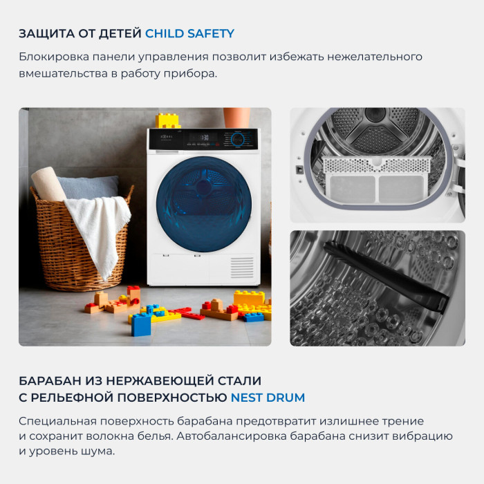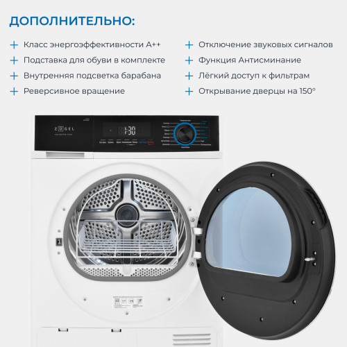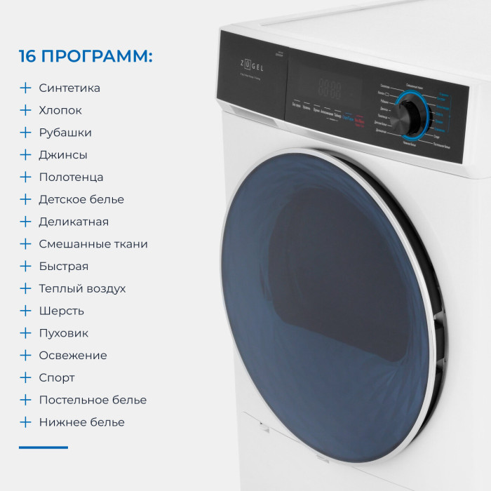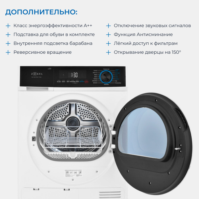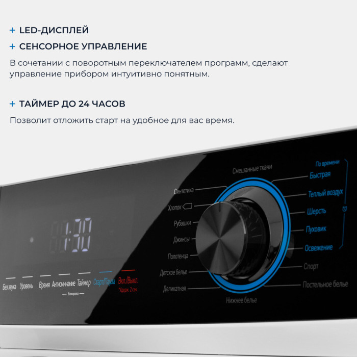контроль влажности, отложенный старт, реверсивное вращение барабана