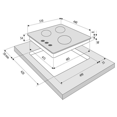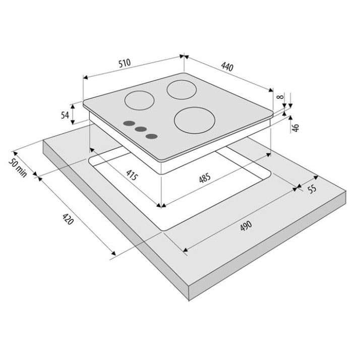мощность дальней левой конфорки: 1.7 кВт, мощность ближней левой конфорки: 1 кВт, мощность центральной правой конфорки: 2.6 кВт; минимальная толщина столешницы: 35 мм; длина шнура: 1100 мм; вес: 10.32 кг