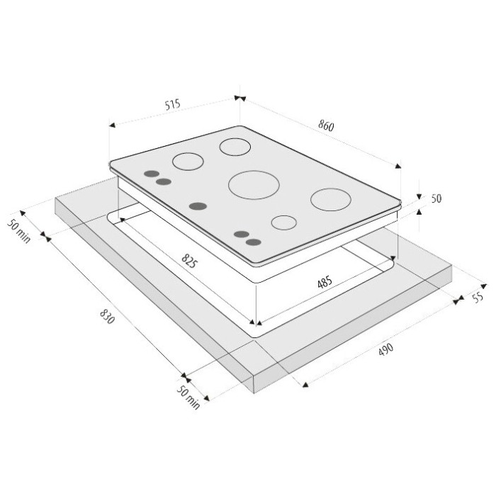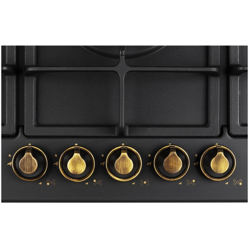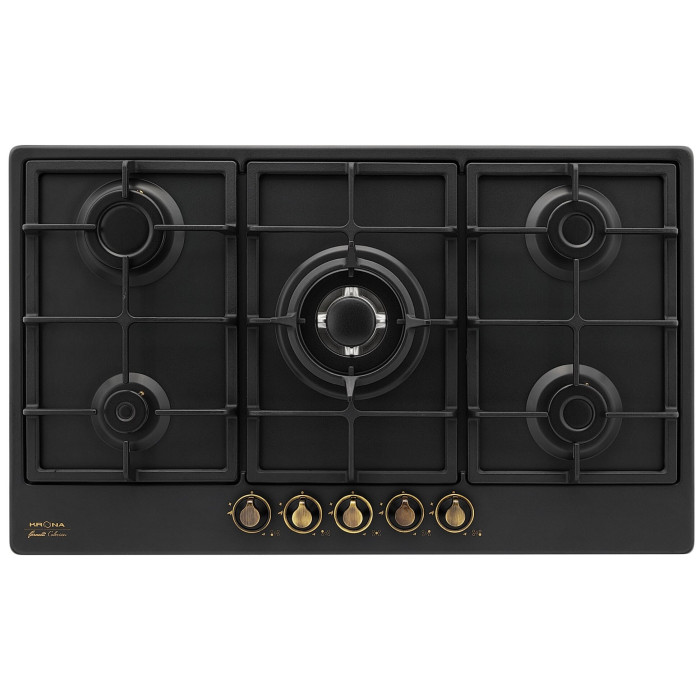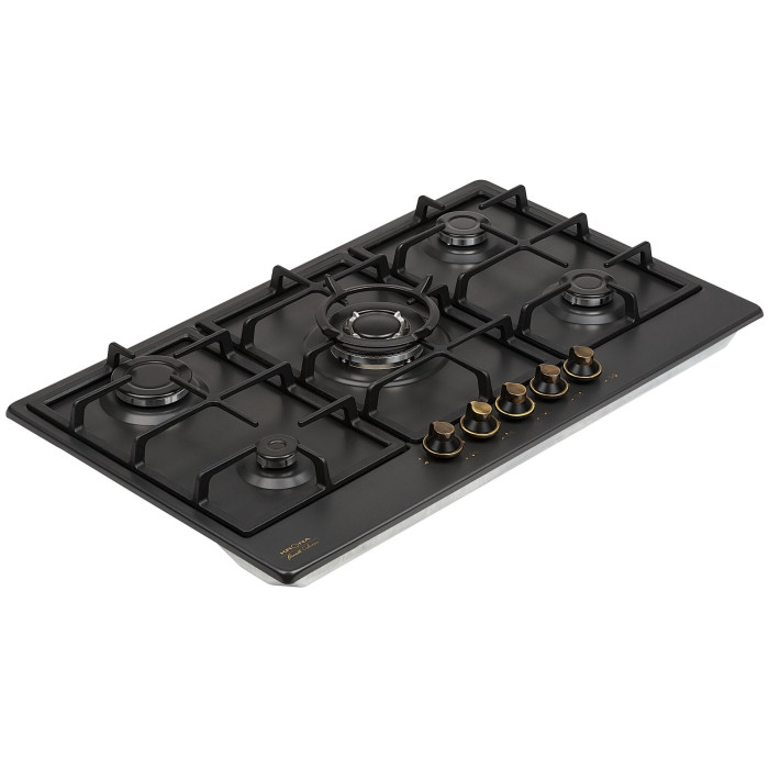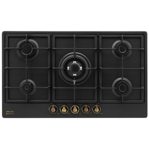 тип панели: газовая, количество конфорок: 5, материал панели: эмаль, установка: независимая, переключатели: поворотные, ширина: 86 см, глубина: 51.50 см, специальные конфорки: Тройная корона, экспресс-конфорка, газ-контроль конфорок