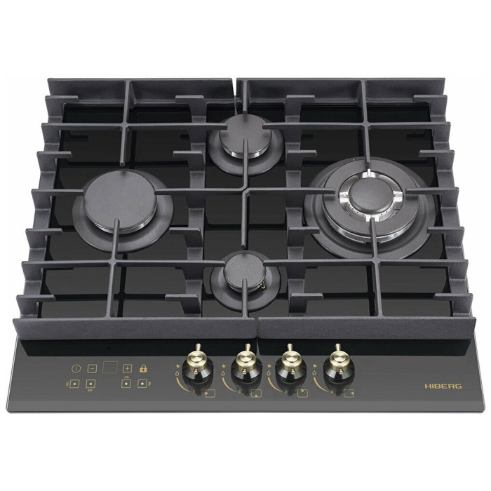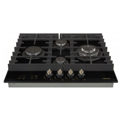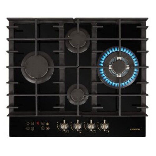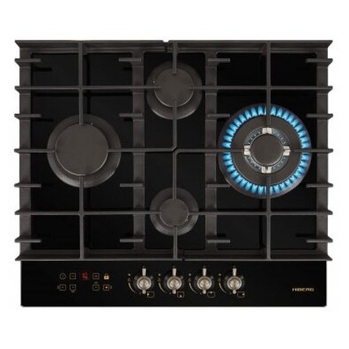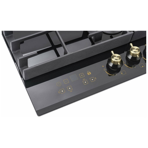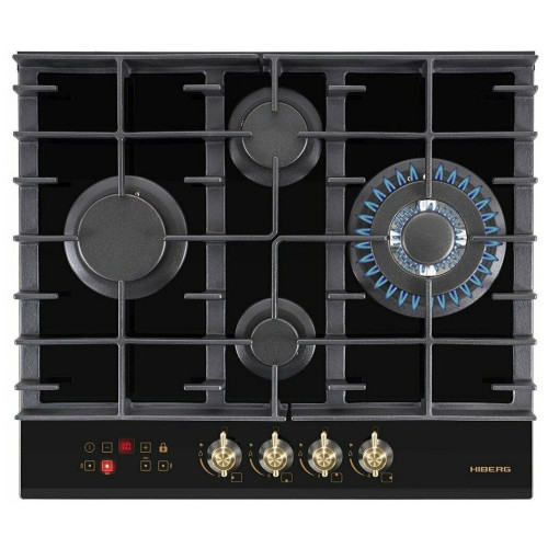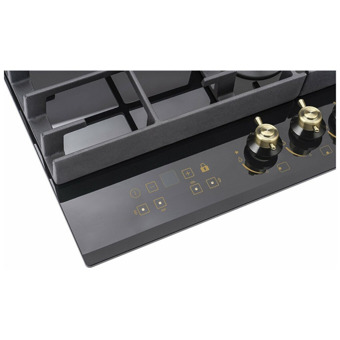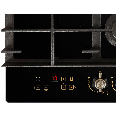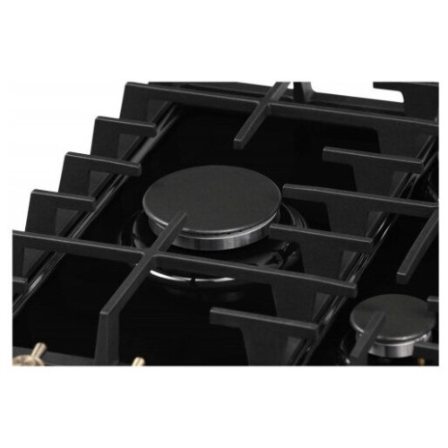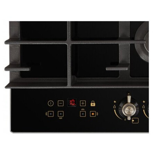 тип панели: газовая, количество конфорок: 4, материал панели: закаленное стекло, установка: независимая, переключатели: поворотные, ширина: 58.40 см, глубина: 51 см, специальные конфорки: Тройная корона, трехконтурная, газовая, газ-контроль конфорок, безопасность: защитное отключение конфорок, функции: таймер