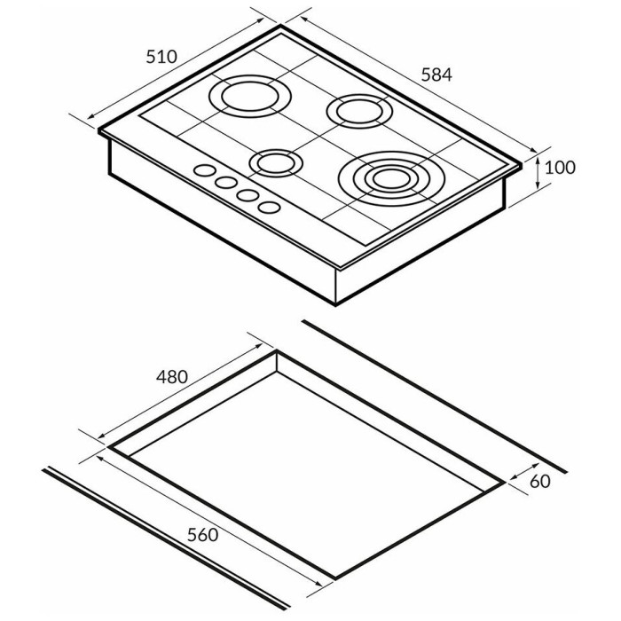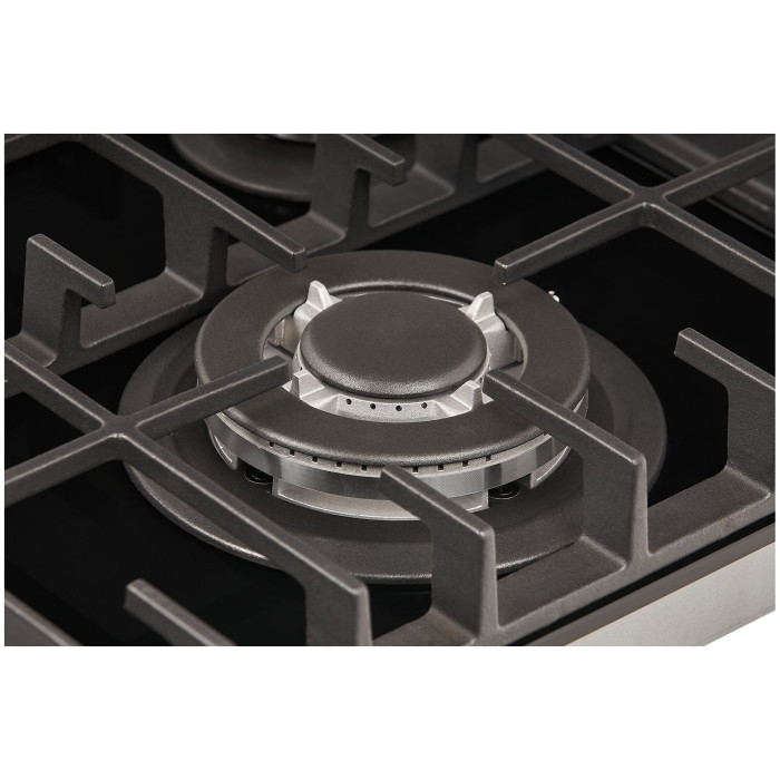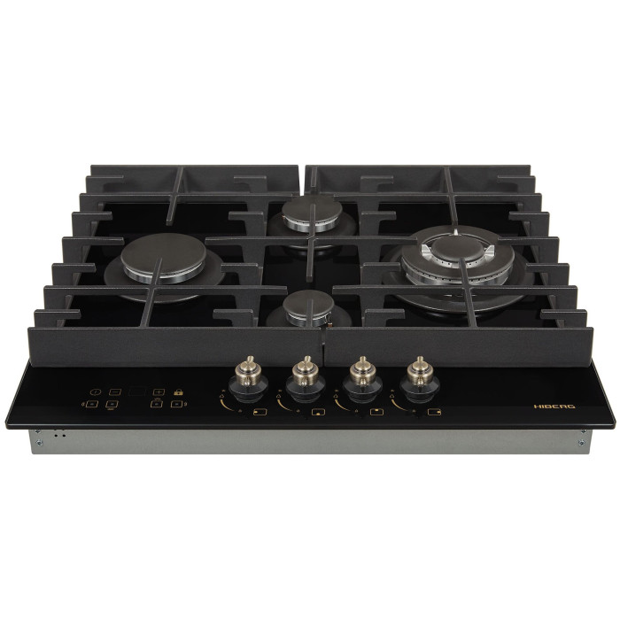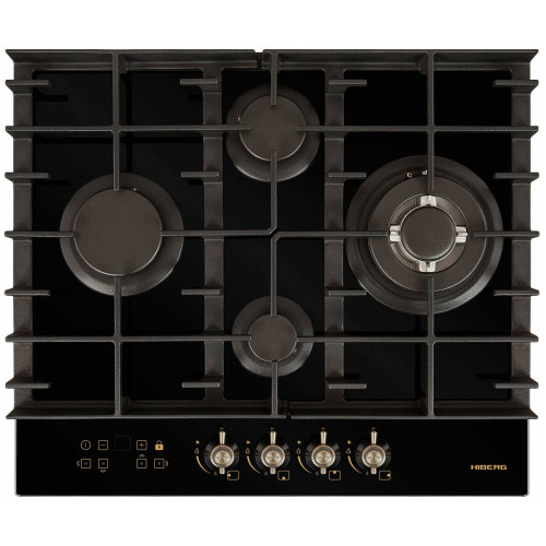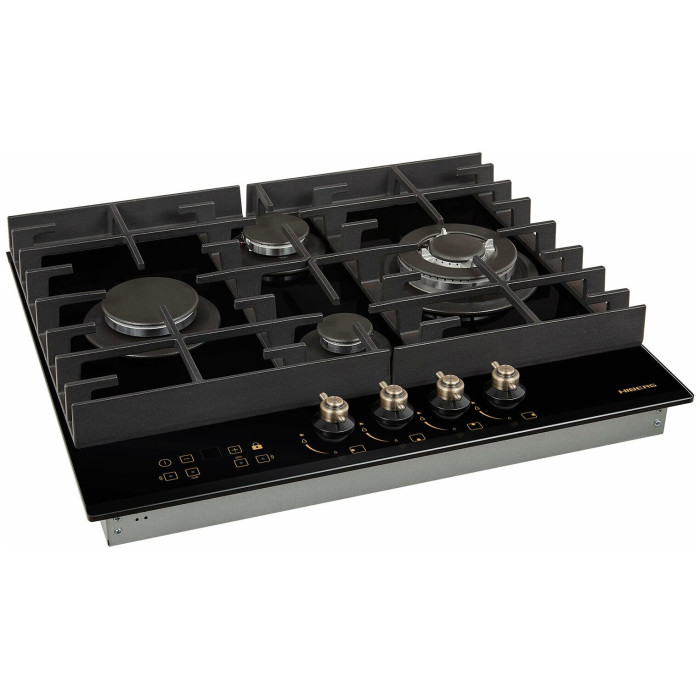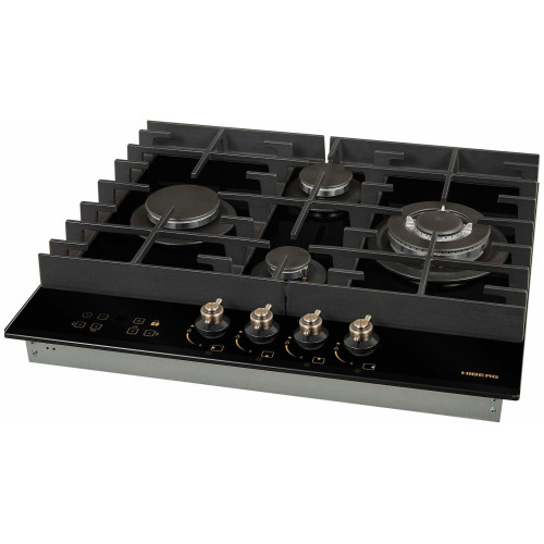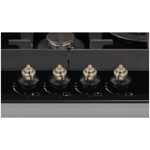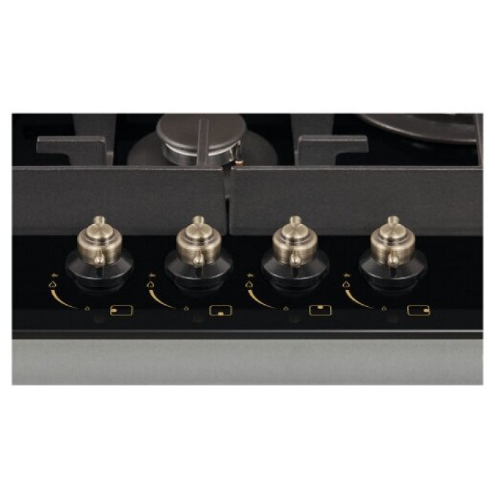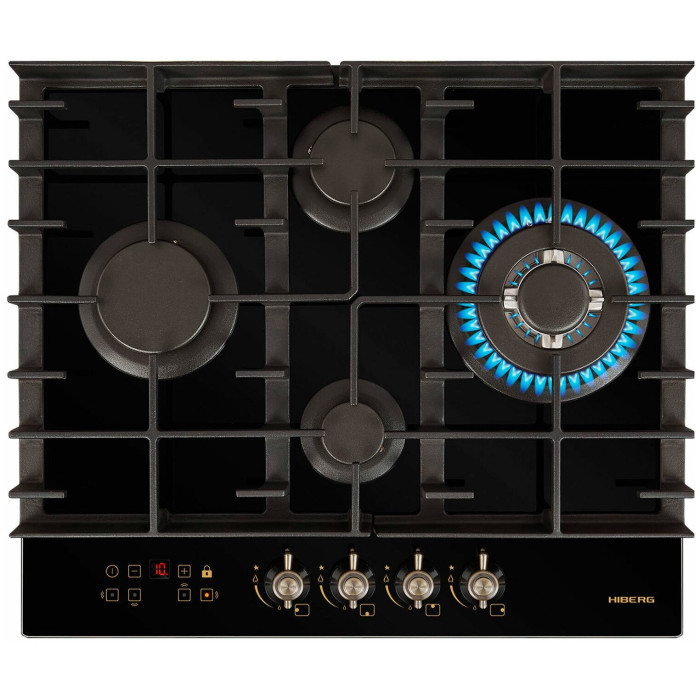 тип панели: газовая, количество конфорок: 4, материал панели: закаленное стекло, установка: независимая, переключатели: поворотные, ширина: 58.40 см, глубина: 51 см, специальные конфорки: Тройная корона, трехконтурная, газовая, газ-контроль конфорок, безопасность: защитное отключение конфорок, функции: таймер