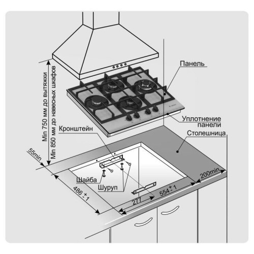 тип панели: газовая, количество конфорок: 4, материал панели: закаленное стекло, установка: независимая, переключатели: поворотные, ширина: 60 см, глубина: 52.50 см, газ-контроль конфорок