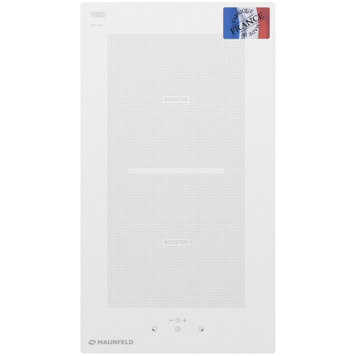 9 уровней нагрева Flex zone Таймер приготовления для каждой зоны Таймер минутный (часы для варки яиц на 3 мин.) Индикатор остаточного тепла Замок от детей Блокировка всех элементов в случае мокрой поверхности Автоматическое отключение Бустер на 2000 Вт За счет дополнительного технологического слоя, панели из белого стекла имеют более насыщенный цвет и устойчивость к выцветанию Сделано во Франции Функция "Форсаж" - переводит выбранную конфорку в режим усиленного нагрева. При включении этой функции, конфорки в течение 5 минут работают на сверхвысокой мощности. Указанная функция используется, к примеру, для быстрого нагрева большого объёма воды. Функция мост и автоматический мост - данная функция позволяет использовать 2 конфорки одновременно как одну. Использование функции «Форсаж» в данном режиме невозможно. Блокировка панели управления - во избежание изменения настроек конфорок, в особенности во время очистки, панель управления может быть заблокирована (за исключением кнопки таймер Автоматическая остановка по окончании времени приготовления- после истечения времени приготовления на дисплее будут мигать символы [ 00 ] и включится звуковой сигнал. Фронтальное управление происходит с помощью сенсора. 2 индукционных элемента с бустерами (разгонными блоками) для каждого моста в целом (и для каждого нагревательного элемента в отдельности). Индукционная панель выполнена из французской стеклокерамики EuroKera (Франция). 2 конфорки мощностью: 1400 (бустер до 2000) Вт Ширина: 310 мм Размеры для встраивания: 275*490 мм (Ш*Г)