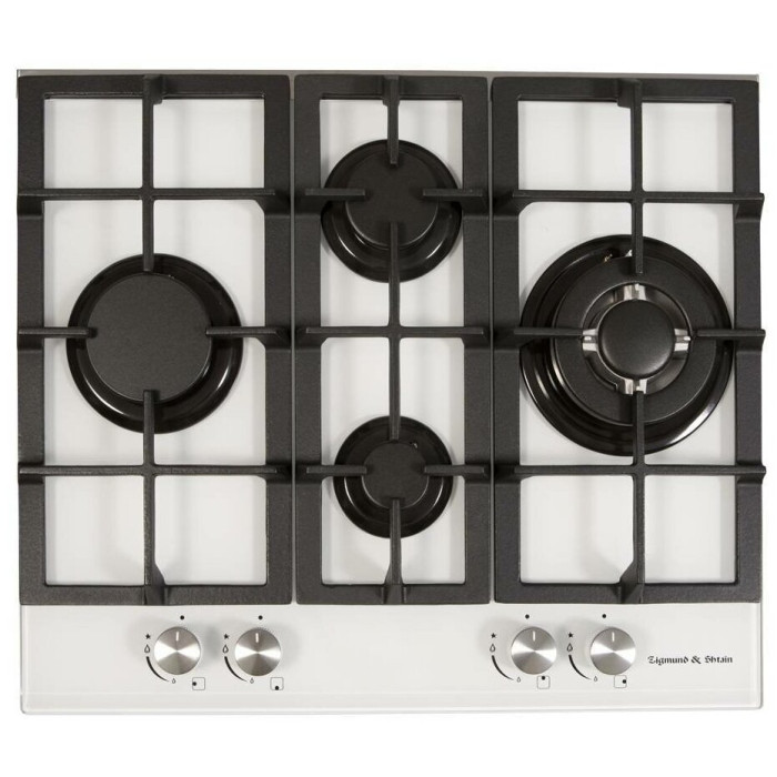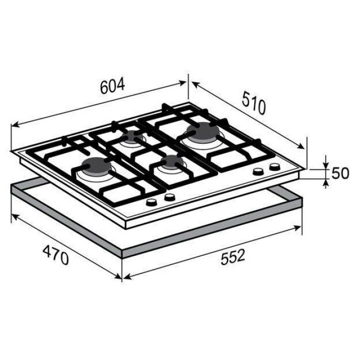 тип панели: газовая, количество конфорок: 4, материал панели: закаленное стекло, установка: независимая, переключатели: поворотные, ширина: 60.40 см, глубина: 51 см, специальные конфорки: Тройная корона, газ-контроль конфорок