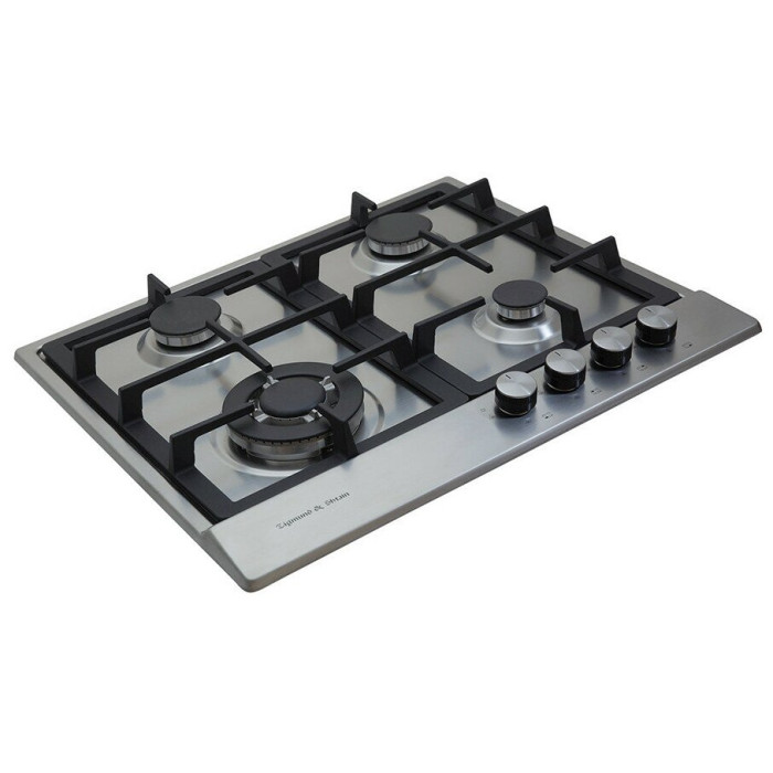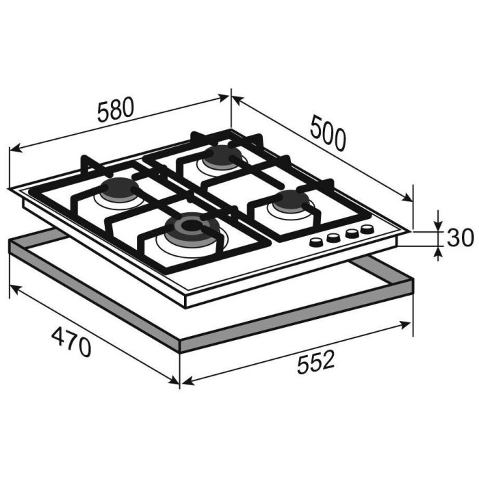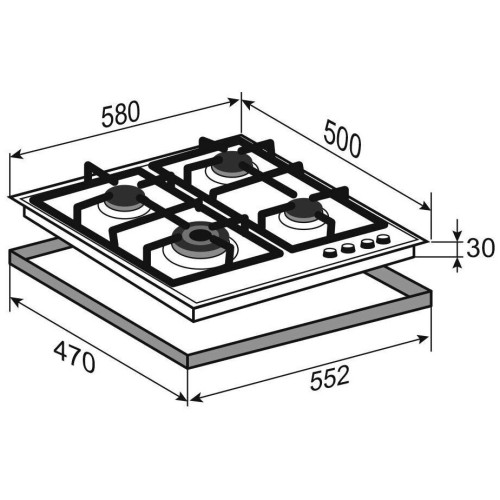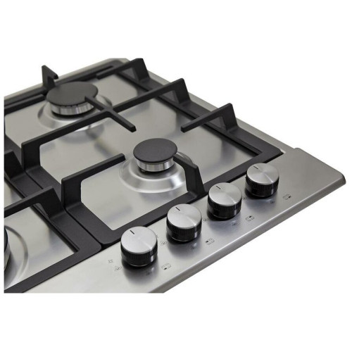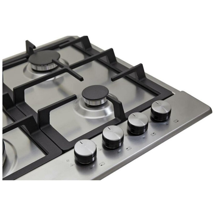 тип панели: газовая, количество конфорок: 4, материал панели: нержавеющая сталь, установка: независимая, переключатели: поворотные, ширина: 58 см, глубина: 50 см, специальные конфорки: Тройная корона, газ-контроль конфорок