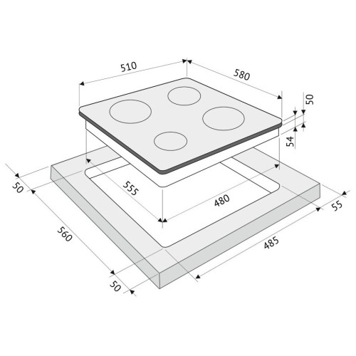 дальняя левая: 145 мм * 1,6/1,8 кВт; дальняя правая: 200 мм * 1,6/1,8 кВт; ближняя левая: 200 мм * 1,6/1,8 кВт; ближняя правая: 145 мм * 1,6/1,8 кВт