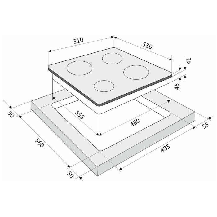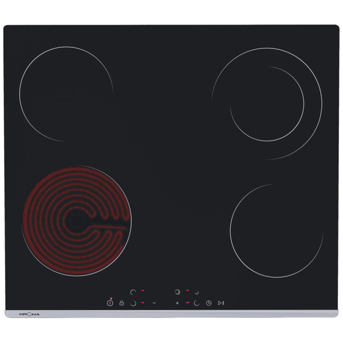 Мощность и диаметр конфорок: Дальняя левая: 145 мм * 1,2 кВт; Дальняя правая: 145/180 мм * 0,7/1,7 кВт; Ближняя левая: 180 мм * 1,8 кВт; Ближняя правая: 145 мм * 1,2 кВт