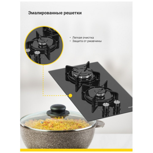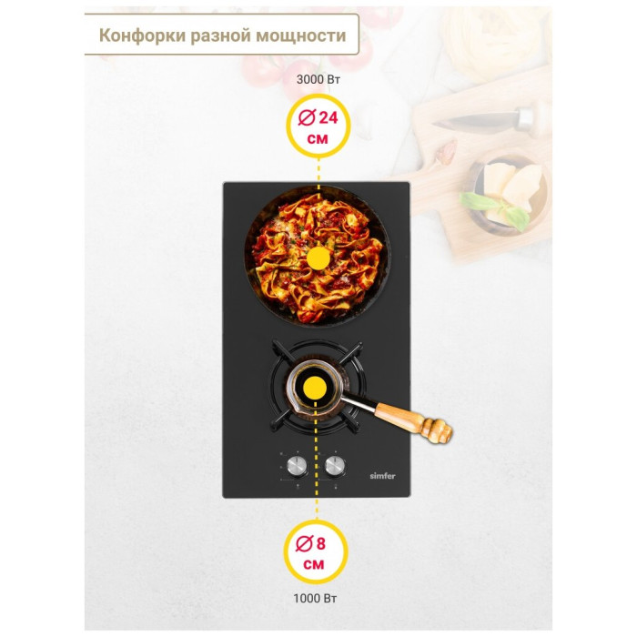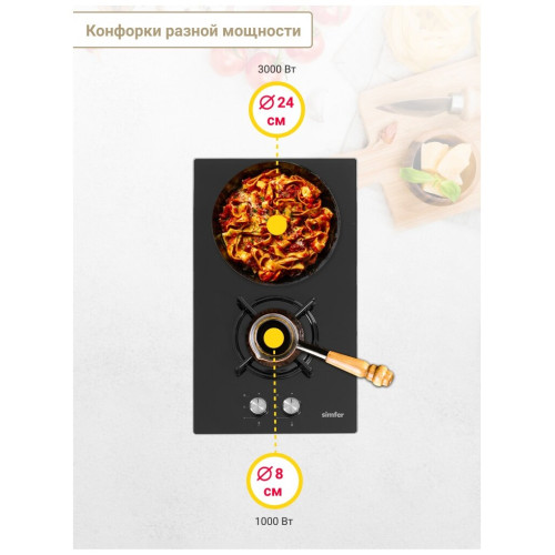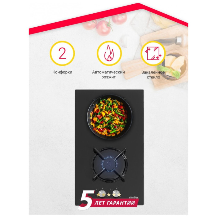 Газовая варочная панель Simfer H30N20B416 - модель, которая благодаря своим компактным размерам органично впишется в интерьер вашей кухни и сделает ежедневный процесс приготовления еды комфортным. Мощность конфорок: 1 х конфорка повышенной мощности 3000 Вт. 1 x экономичная конфорка 1000 Вт. Материал решеток - эмалированная сталь. Материал рабочей поверхности - жаростойкое закаленное стекло, которое имеет красивый зеркальный вид. На ней располагаются две конфорки - разные по диаметру и мощности пламени в них. А значит вы сможете выбрать оптимальную конфорку для приготовления разнообразных блюд. Для удобного пользования в поворотные переключатели встроен электроподжиг, который значительно упрощает работу с панелью. Начните готовить изысканные блюда вместе с варочной панелью Simfer!