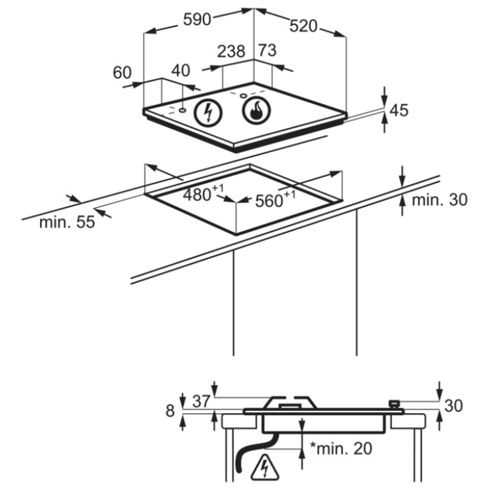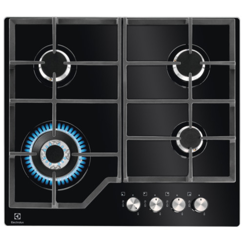 тип панели: газовая, количество конфорок: 4, материал панели: закаленное стекло, установка: независимая, переключатели: поворотные, ширина: 59 см, глубина: 52 см, специальные конфорки: Двойная корона, газ-контроль конфорок