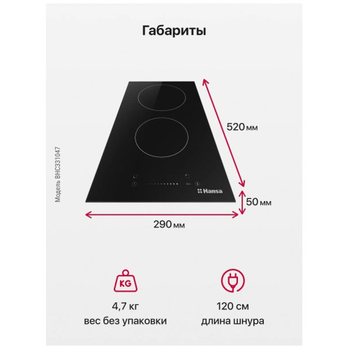 Варочная поверхность Hansa BHC331047 создана, чтобы сделать вашу кухню функциональнее. Быстро нагреваясь, 2 электрические конфорки HiLight сэкономят время для общения с семьей за столом. Поверхность так же имеет сенсорное управление. Чтобы включить/выключить конфорку, изменить температуру, достаточно прикоснуться к кнопкам управления пальцем.