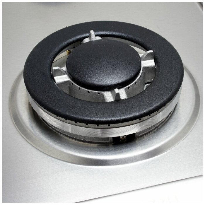 тип панели: газовая, количество конфорок: 4, материал панели: нержавеющая сталь, установка: независимая, переключатели: поворотные, ширина: 59 см, глубина: 51 см, специальные конфорки: Тройная корона, газ-контроль конфорок