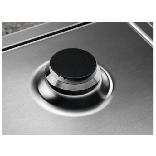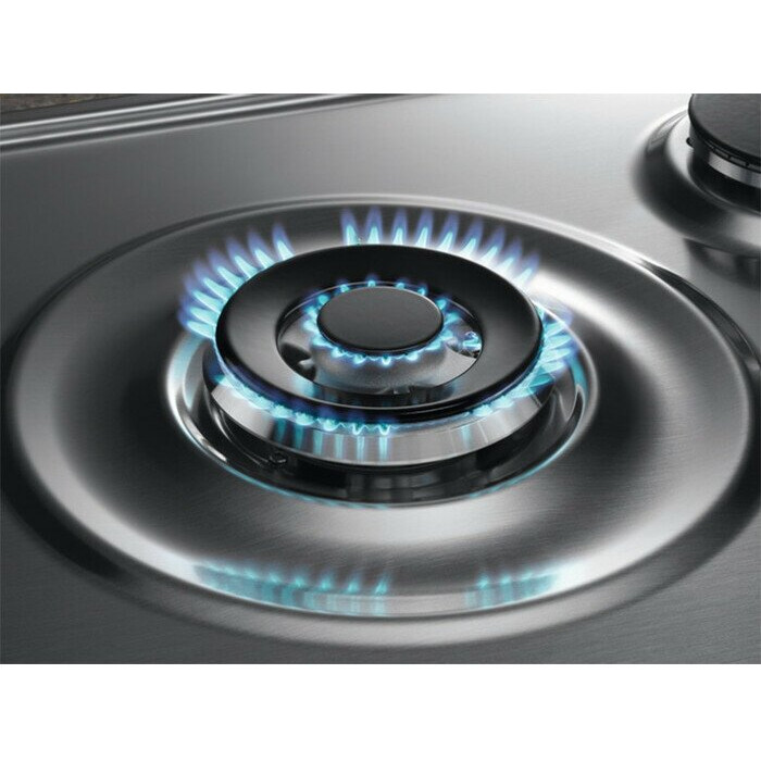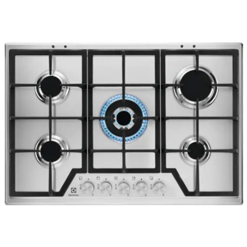тип панели: газовая, количество конфорок: 5, материал панели: нержавеющая сталь, установка: независимая, переключатели: поворотные, ширина: 74.40 см, глубина: 51 см, специальные конфорки: Двойная корона, газ-контроль конфорок