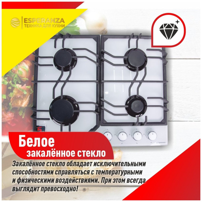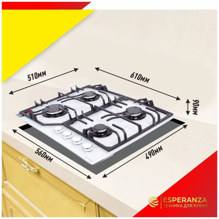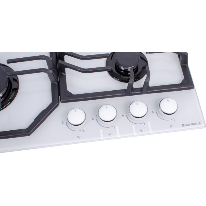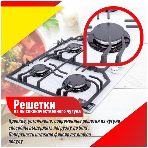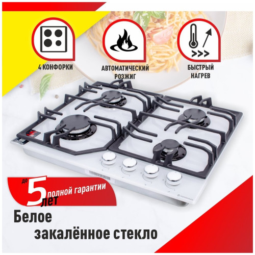 тип панели: газовая, количество конфорок: 4, материал панели: закаленное стекло, установка: независимая, переключатели: поворотные, ширина: 61 см, глубина: 51 см, газ-контроль конфорок, функции: Комплект для подключения газового баллона, максимальная потребляемая мощность: 5.90 кВт