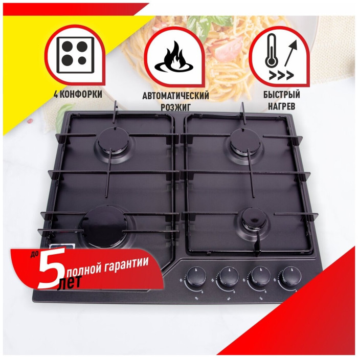 тип панели: газовая, количество конфорок: 4, материал панели: эмаль, установка: независимая, переключатели: Механическое, ширина: 61 см, глубина: 51 см, рамка, функции: Комплект для подключения газового баллона, максимальная потребляемая мощность: 7.90 кВт
