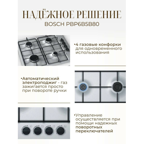 Тип панели: газовая; Установка: независимая; Материал панели: эмалированная сталь; Расположение панели управления: справа; Переключатели: поворотные; Рамка: нет; Общее количество конфорок: 4; Электроподжиг: есть