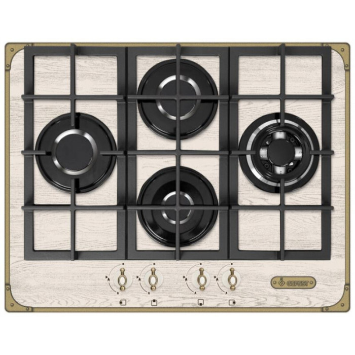 тип панели: газовая, количество конфорок: 4, установка: независимая, переключатели: поворотные, ширина: 67 см, глубина: 52.50 см, специальные конфорки: Двойная корона