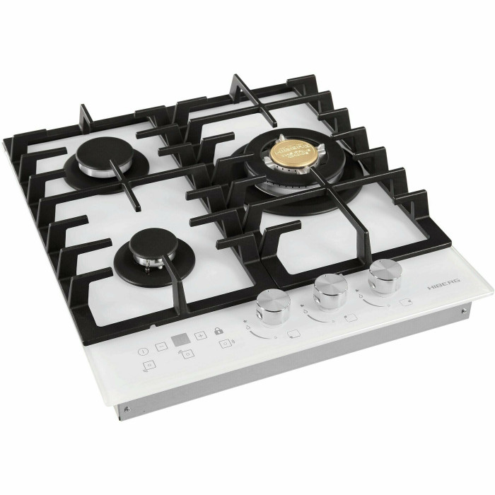 Тип панели: газовая; Установка: независимая; Материал панели: закаленное стекло; Расположение панели управления: спереди; Переключатели: поворотные; Рамка: нет; Общее количество конфорок: 3; Конфорок газовых: 3