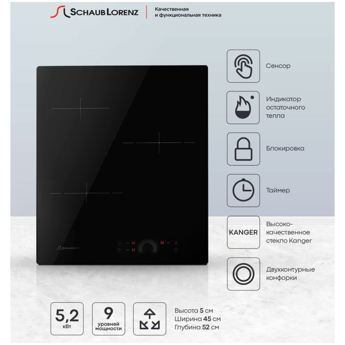 защитное отключение конфорок, индикатор остаточного тепла, кнопка блокировки панели, защитное отключение конфорок, индикатор остаточного тепла, кнопка блокировки панели