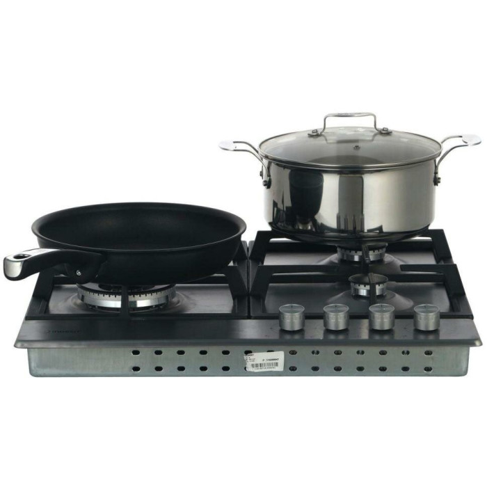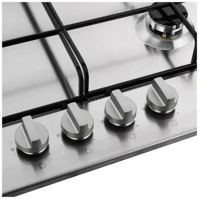 Газ на металле; 4 высокоэффективные конфорки; 60см; одна зона с двойным уровнем пламени; автоподжиг; газ-контроль; чугунные решетки; Расположение панели управления фронтальное; Цвет: Нержавеющая сталь