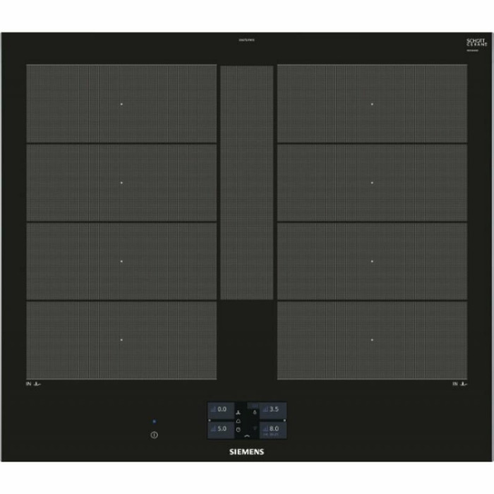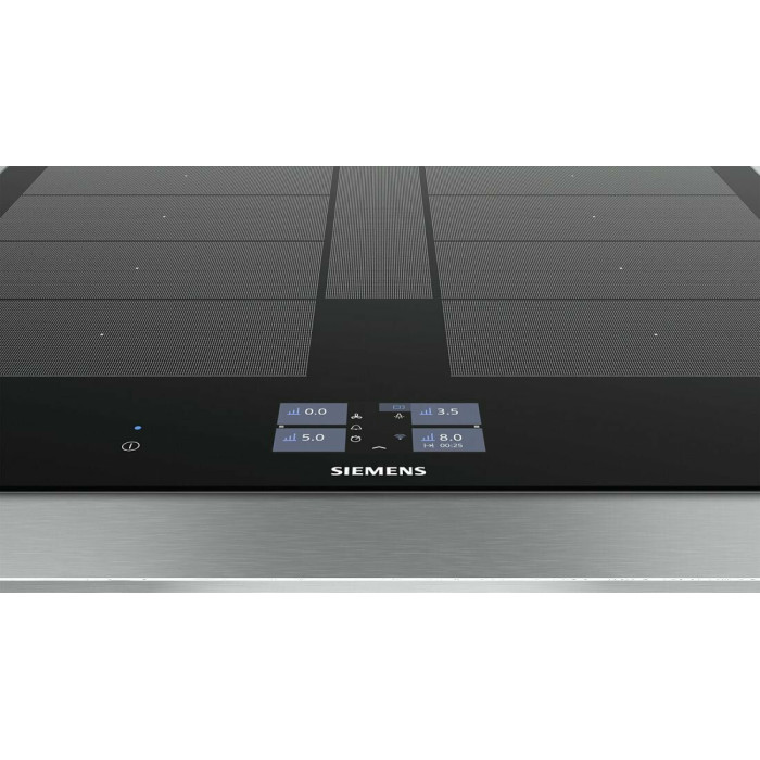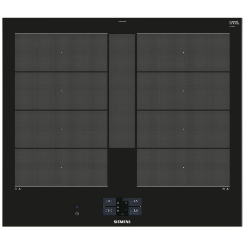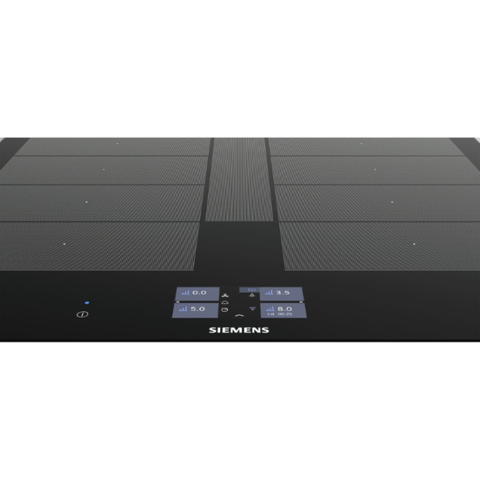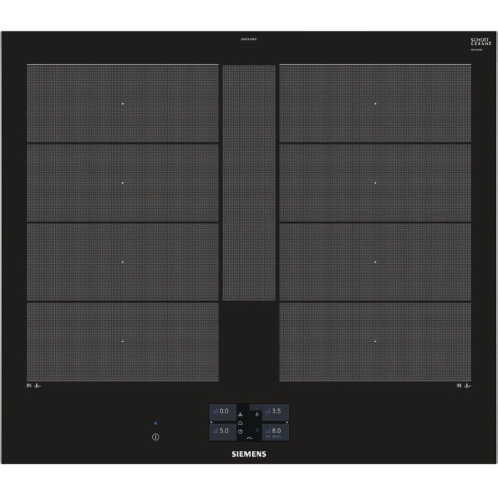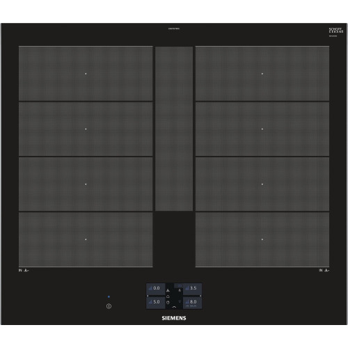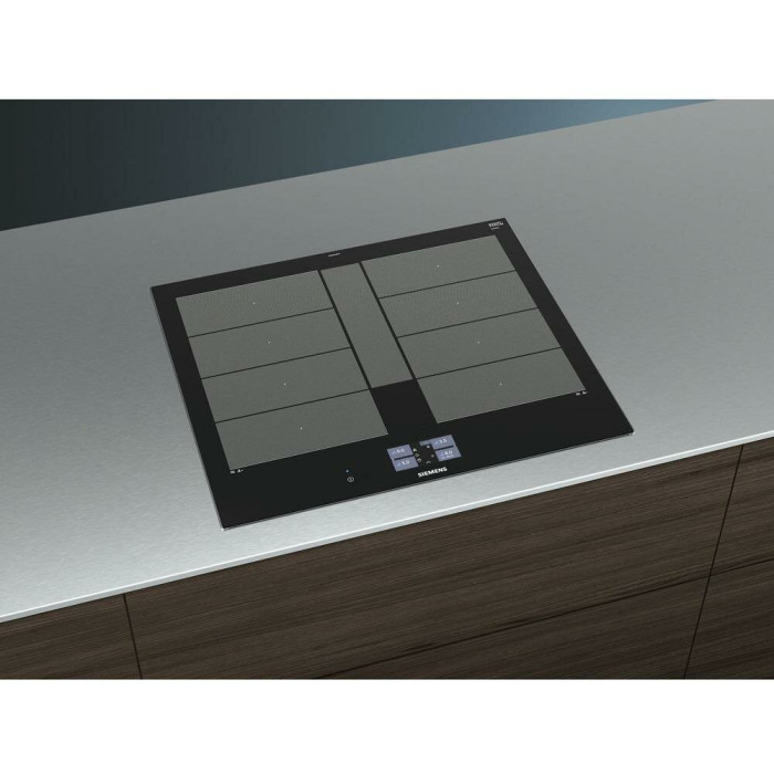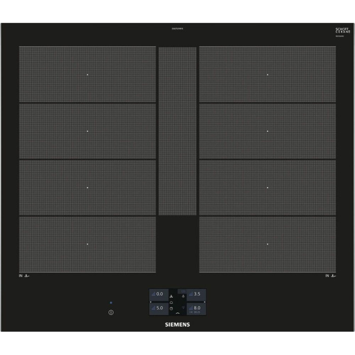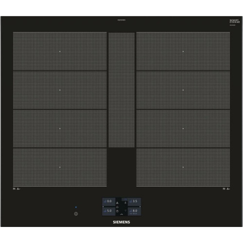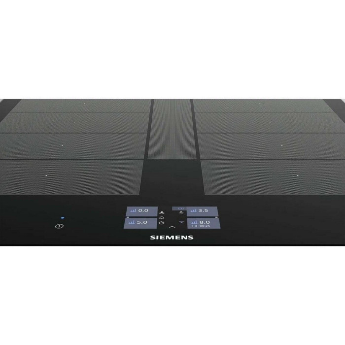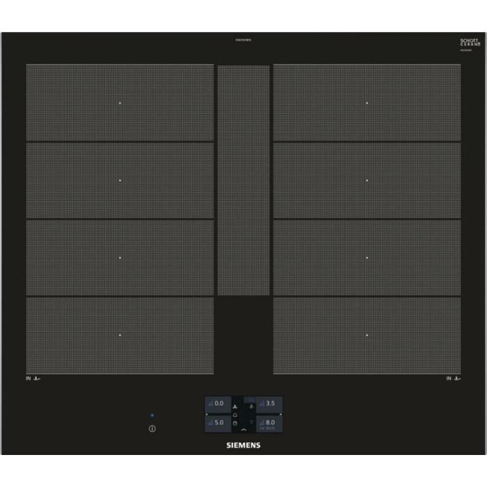 Независимая индукционная варочная панель Siemens EX675JYW1E Индукционная варочная панель Siemens EX675JYW1E Home Connect нагревает дно посуды, а не поверхность под посудой, что делает ее безопасной. Стеклокерамическая рабочая поверхность варочной панели переносит большие нагрузки и отмыть ее возможно без дорогостоящих моющих средств. 4 конфорки и инновационные функции встраиваемой EX675JYW1E превратят приготовление блюд в кулинарное искусство. Сенсорное управление Touchscreen и цветной TFT-дисплей обеспечивают комфортное управление и свободное настраивание требуемого уровня мощности Функция quickStart автоматически находит конфорку, на которой есть посуда при включении варочной панели Запрограммировать время приготовления блюда можно с функцией «Таймер». По окончании заданного времени зона нагрева автоматически отключается С функцией PowerBoost можно изрядно увеличить мощность зоны индукционного нагрева для быстрого нагрева Зона CombiZone объединяет зоны нагрева для посуды по типу жаровен Зона FlexInduction: возможность объединять несколько прямоугольных конфорок в одну большую, допуская использовать посуду очень больших размеров или несколько небольших кастрюль одновременно. Полная информация о товаре, изготовителе, комплектации, технических характеристиках и функциях содержится в технической документации. основные характеристики Вид индукционная Способ подключения электрический Установка независимая Цвет панели конфорок черный Цвет рамки черный Материал стеклокерамика технические особенности Общее количество конфорок 4 Дисплей 4,1" цветной TFT-дисплей Количество ступеней мощности 17 Управление сенсорное Touchscreen Cleaning-пауза есть Функция ShortBoost есть Функция quickStart есть Функция Power Boost есть Функция re-Start есть Функция MoveMode? есть Функция Power Management есть Переключатели сенсорные Сенсор жарения fryingSensor Plus есть Зона CombiZone для большой посуды по типу жаровень есть Зона FlexInduction есть Распознавание наличия посуды есть Индикация уровня мощности нет Таймер конфорок с отключением конфорок и/или подачей звукового сигнала дизайн Cерия IQ IQ700 Скошенный фронт есть Скошенные края по фронту и бокам нет Рамка из стали по периметру нет Home Connect есть конфигурация конфорок Всего конфорок 4 Индукционных зон нагрева 4 Зона нагрева FlexZone 2 Конфорок с зонами расширения есть Суммарная мощность конфорок 7.4 кВт Конфорок двухконтурных есть Конфорок быстрого нагрева есть мощность варочных ЗОН Мощность передней левой конфорки 2.2 Вт Мощность задней левой конфорки 2.2 Вт Мощность передней правой конфорки 2.2 Вт Мощность задней правой конфорки 2.2 Вт диаметр варочных ЗОН Размер передней лeвой конфорки 19 см Размер задней левой конфорки 19 см Размер передней правой конфорки 19 см Размер задней правой конфорки 19 см безопасность Защитное отключение есть Блокировка от детей есть Индикатор остаточного тепла 2-х позиционный для каждой конфорки Главный выключатель есть размеры Габариты, см (ВхШхГ) 5.1 × 60.2 × 52 см Возможность встраивания в столешницу толщиной от 30 мм Ширина 60.2 см Высота 5.1 см Глубина 52 см Размеры ниши для встраивания (ШхГ) 56 × 49 см энергетические характеристики Мощность подключения 7400 Вт Напряжение 220 Вт