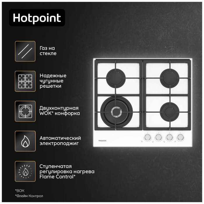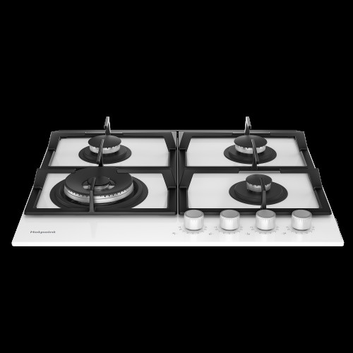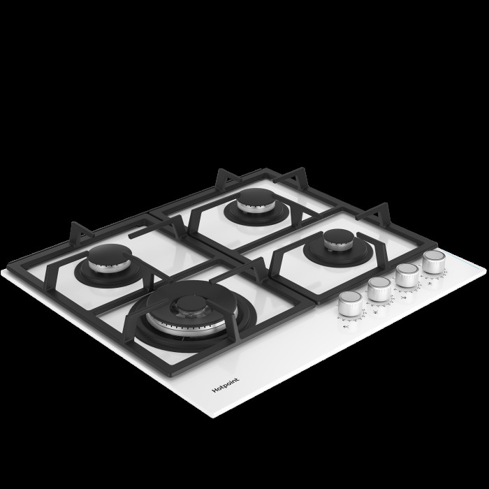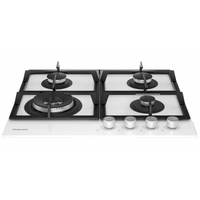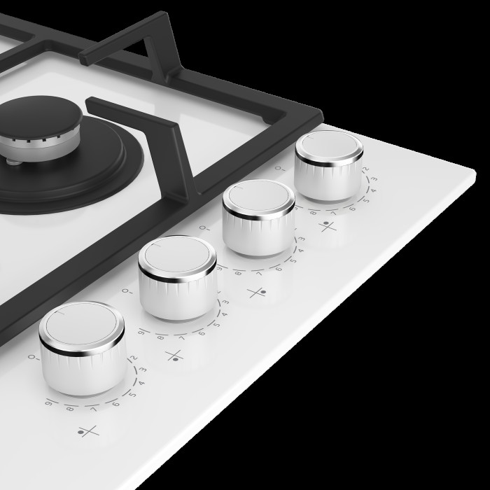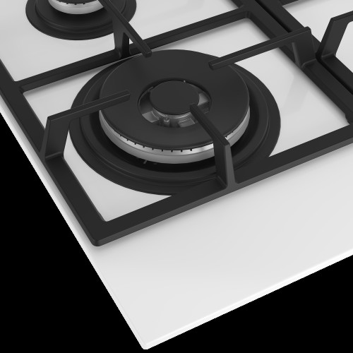 Газовая варочная поверхность (газ на стекле) 4 зоны, Step Flame, одна зона с двойным уровнем пламени, автоподжиг, газ-контроль, чугунные решетки, цвет: белый