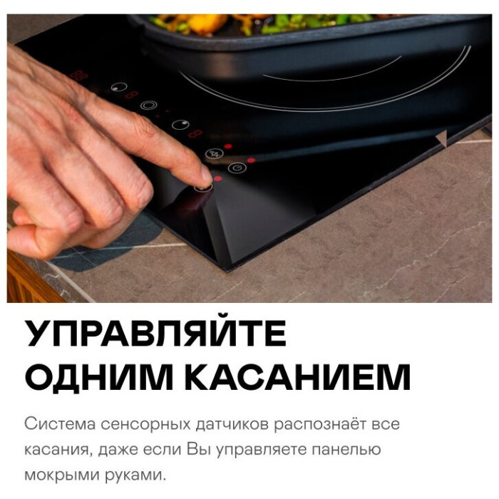 защитное отключение конфорок, индикатор остаточного тепла, кнопка блокировки панели