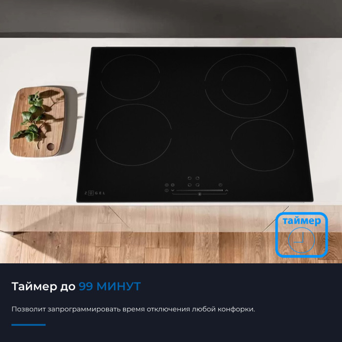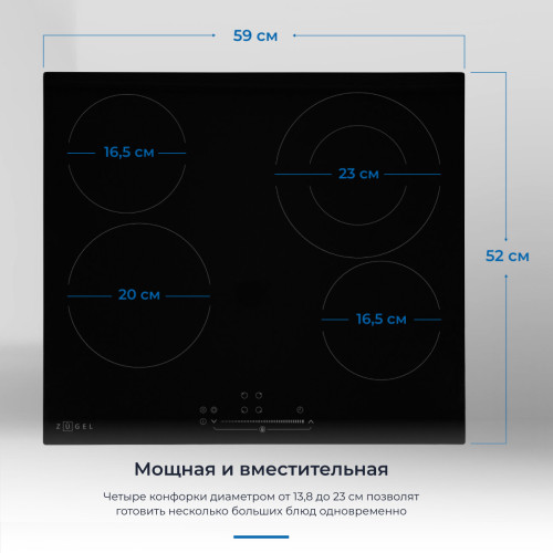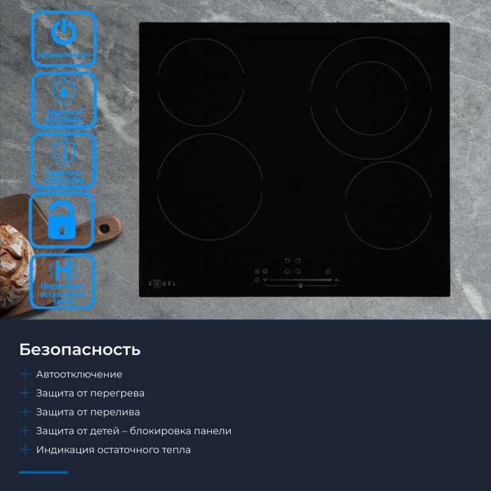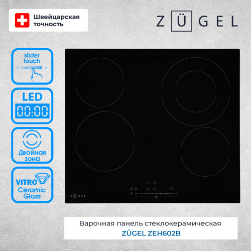Варочная поверхность электрическая ZUGEL ZEH602B - это современное и функциональное решение для вашей кухни. Изготовленная из высококачественной стеклокерамики Vitro Ceramic Glass, варочная панель сочетает в себе прочность и стильный дизайн.