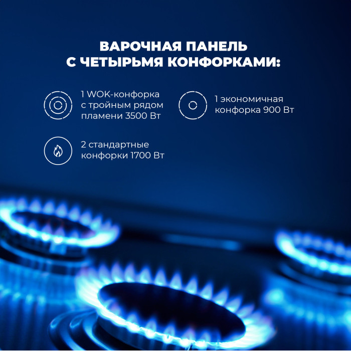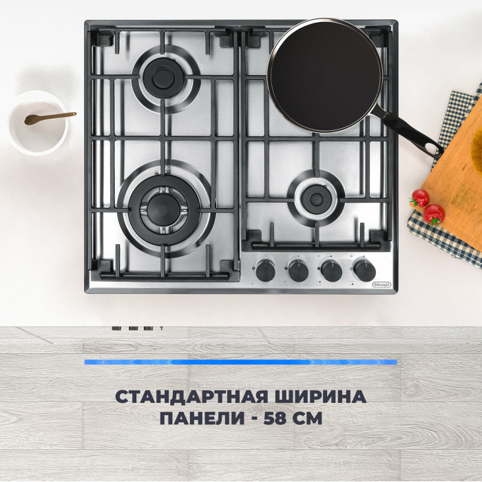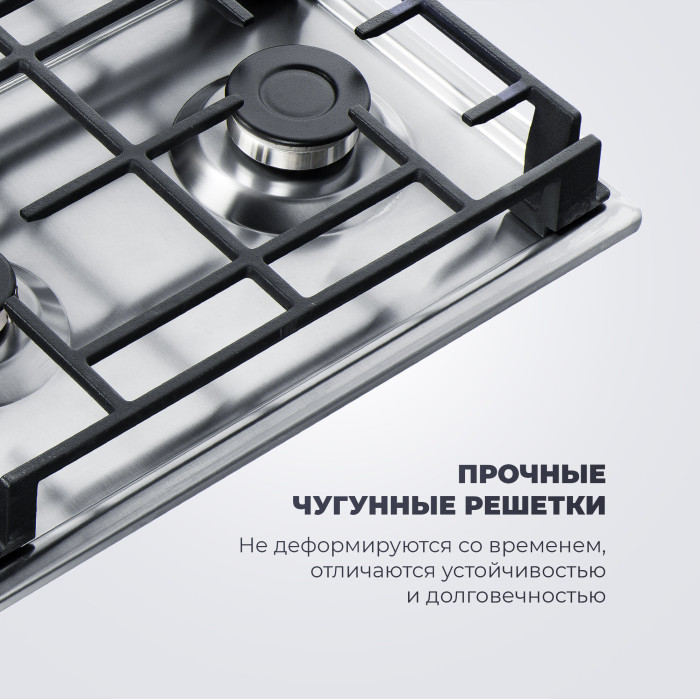 Тип панели: газовая; Установка: независимая; Материал панели: нержавеющая сталь; Расположение панели управления: спереди; Переключатели: поворотные; Рамка: нет; Общее количество конфорок: 4; Конфорок газовых: 4;