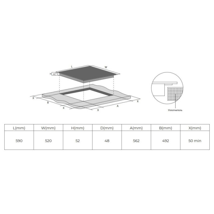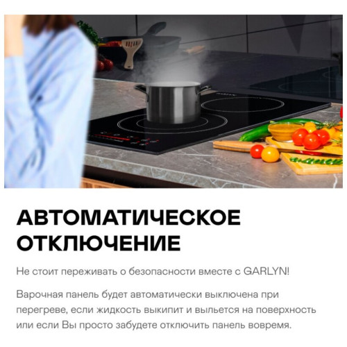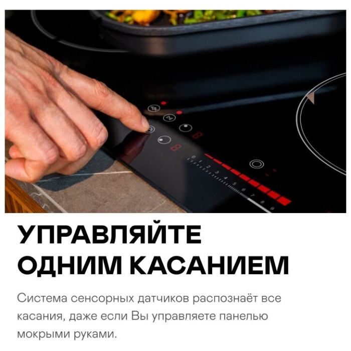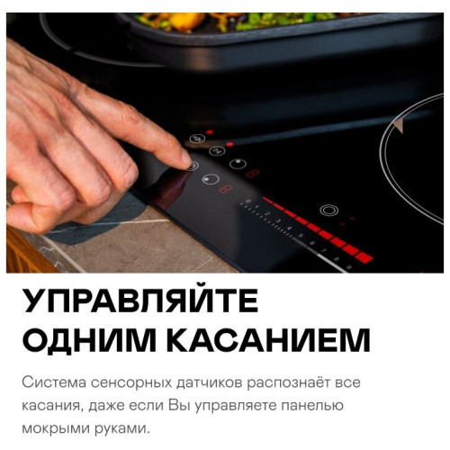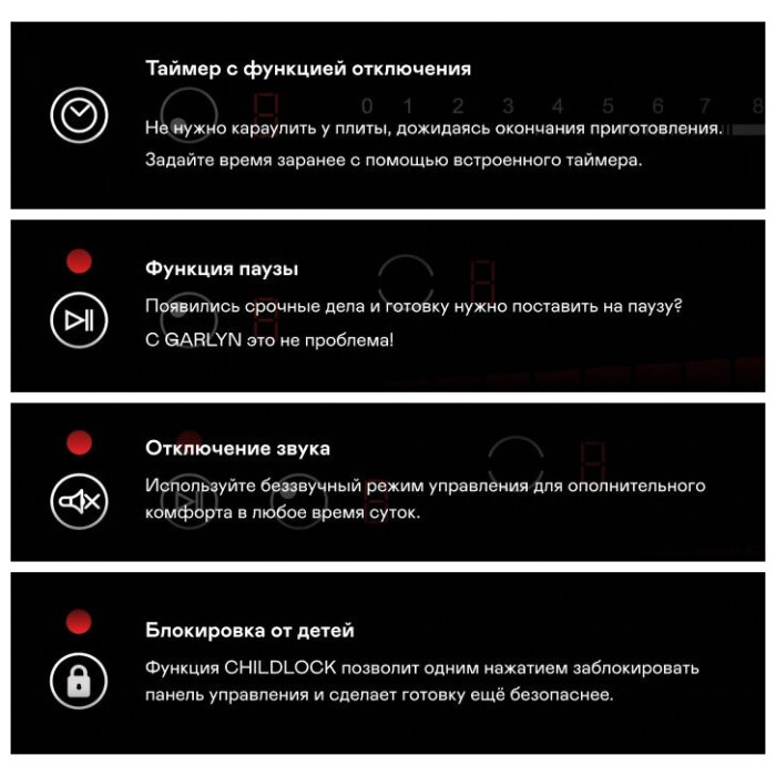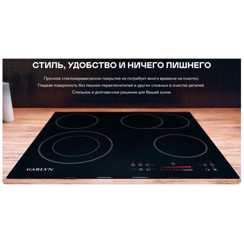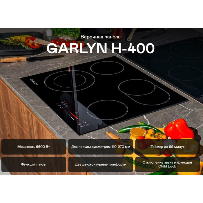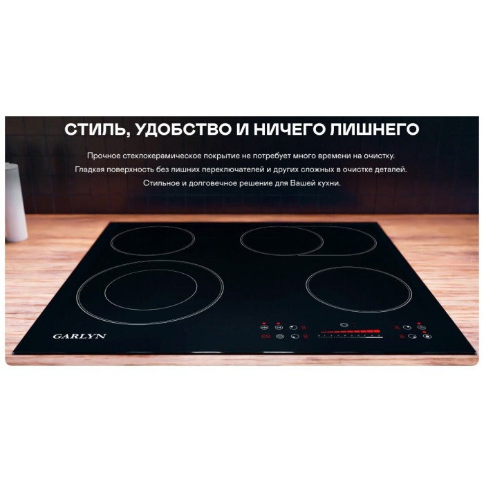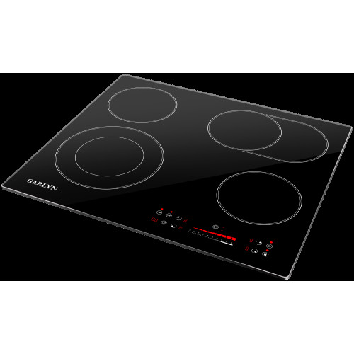 Левая верхняя конфорка -165 мм. Левая нижняя конфорка -145/230 мм. Правая верхняя конфорка -165/270 мм. Правая нижняя конфорка –165 мм