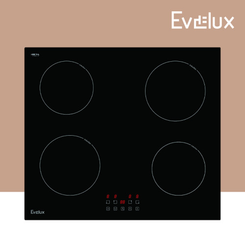 Индукционная варочная панель с 4 конфорками – это идеальная плита для семьи из 3-4 человек. Ширина встраивания – 60 см. Лаконичный дизайн и доступная функциональность – достоинства варочных панелей Evelux.