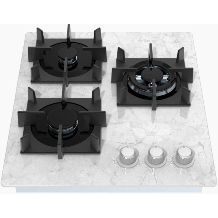 Тип панели: газовая; Установка: независимая; Материал панели: закаленное стекло; Расположение панели управления: спереди; Переключатели: поворотные; Рамка: нет; Общее количество конфорок: 3; Электроподжиг: есть;