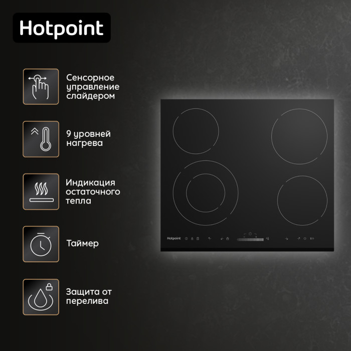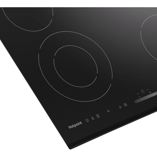 Встраиваемая электрическая панель Hotpoint HR 6T2 B S выполнена из ударопрочной стеклокерамики черного цвета. Поверхность легко очищается от загрязнений с помощью влажной салфетки. Прибор устанавливается в нишу размером 56х49 см. Минимальная толщина столешницы — 3,7 см.