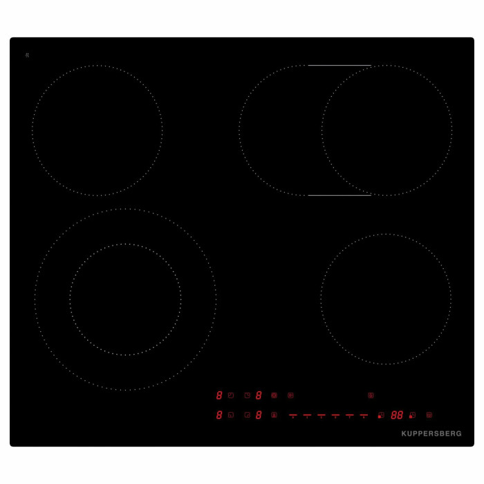 Длина сетевого шнура 90 см, Конфорки Мощность конфорок, кВт: передняя левая 1,1 кВт / 2,2 кВт Мощность конфорок, кВт: передняя правая 1,2 кВт Мощность конфорок, кВт: задняя левая 1,2 кВт Мощность конфорок, кВт: задняя правая 1,1 кВт / 2,0 кВт Диаметр зон, мм. передняя левая 230 мм Диаметр зон, мм. передняя правая 165 мм Диаметр зон, мм. задняя левая 165 мм Диаметр зон, мм. задняя правая 270*165 мм, Таймер, Стеклокерамика KANGER, 9 уровней мощности, Особенности дизайна прямые края, Стеклокерамика KANGER