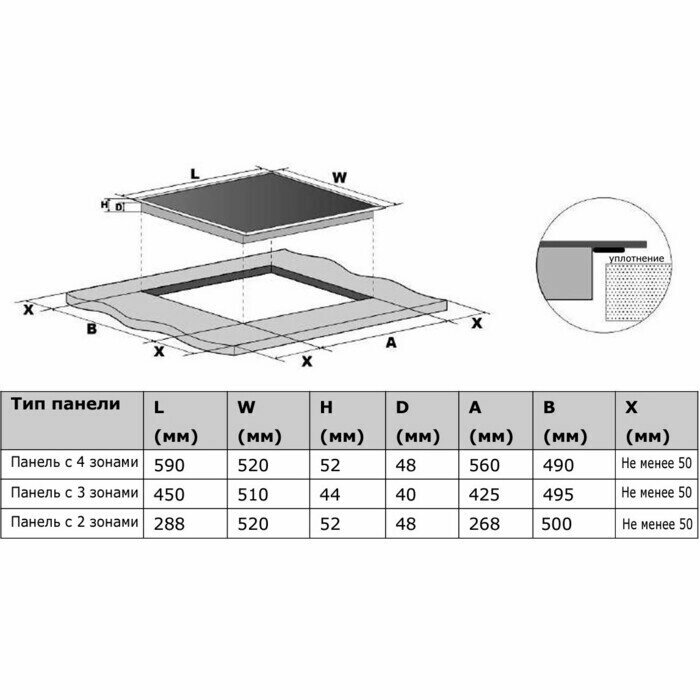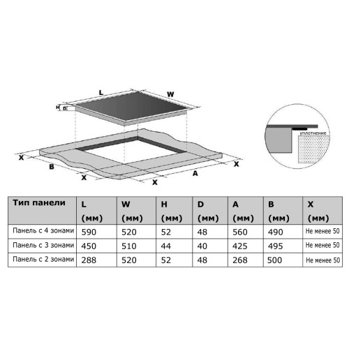 Общие данные: Габариты: 5.2х59х52 см Габариты ниши для встраивания: -х56х49 см Тип конфорок: 4 быстрого нагрева Hi-Light Передняя левая: 200 x 200 мм / 1.8 кВт Передняя правая: 165 x 165 мм / 1.2 кВт Задняя левая: 165 x 165 мм / 1.2 кВт Задняя правая: 200 x 200 мм / 1.8 кВт Зоны расширения: нет Индикация остаточного тепла Управление и функции: Количество уровней мощности: 9 Таймер 1-99 мин Тип управления: сенсорное Обработка края: скошенный край Безопасность: Автоматическое отключение Защитная блокировка от детей Дополнительная информация: Обработка края: скошенный край Номинальная мощность: 6 кВт Сетевой кабель в комплекте Длина сетевого кабеля: 1.2 м Напряжение/Частота: 220-240 B, 50 Гц Вес, кг: 8.2