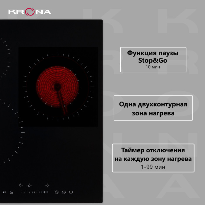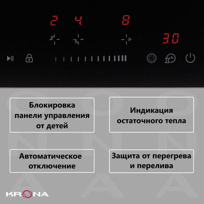 защитное отключение конфорок, индикатор остаточного тепла, кнопка блокировки панели