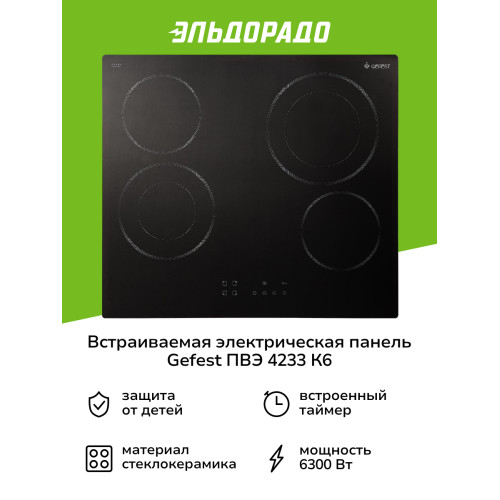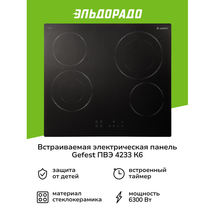Сенсорное управление; Самодиагностика неисправности; Расширенная зона на 2 конфорки; Цифровой дисплей; Отключение при проливе жидкости; Блокировка от детей; Индикация выбранной мощности; В комплекте: сетевой кабель без вилки