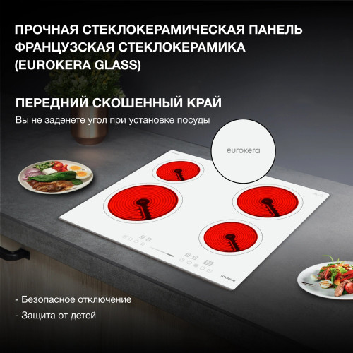 защитное отключение конфорок, индикатор остаточного тепла, кнопка блокировки панели