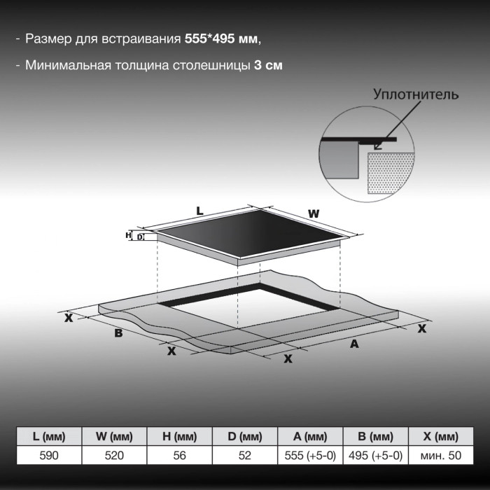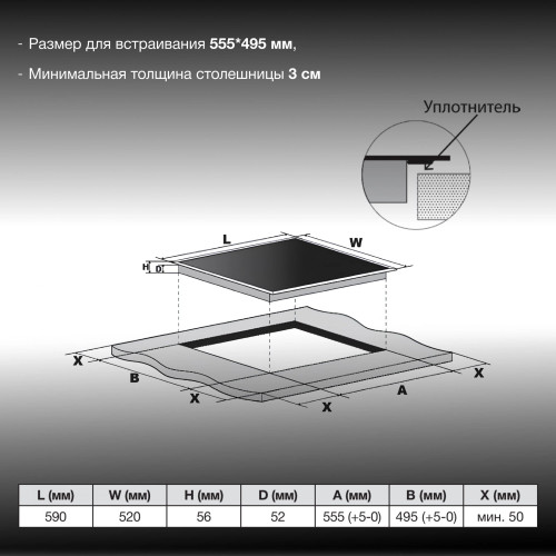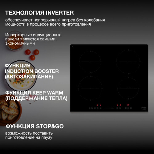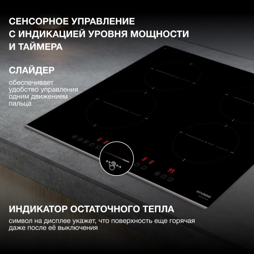 защитное отключение конфорок, индикатор остаточного тепла, кнопка блокировки панели