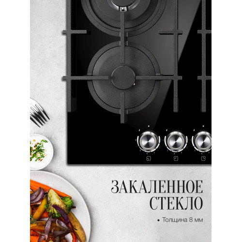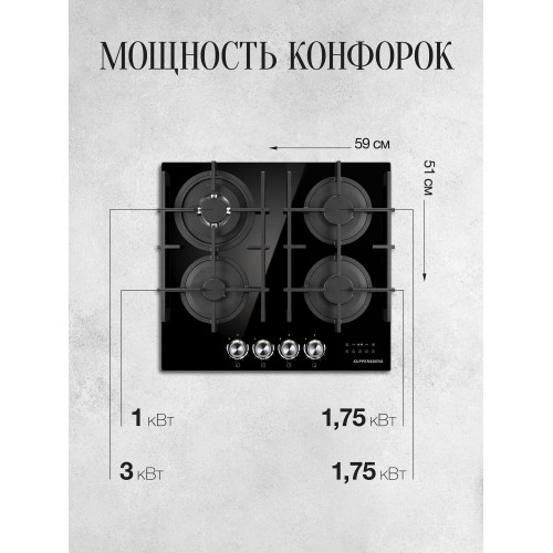 Конфорки: Мощность конфорок, кВт: передняя левая - 1 кВт, передняя правая - 1,75 кВт, задняя левая - 3,0 кВт, задняя правая - 1,75 кВт, Подсветка панели управления, Толщина закалённого стекла - 8 мм, Тип конфорок - Chinese SABAF, Форсунки под сжиженный газ, Таймер, Управление - механическое/сенсорное, Длина сетевого шнура - 100 см