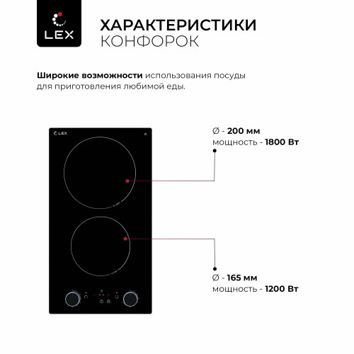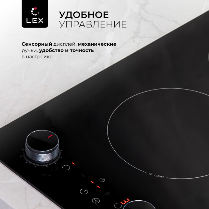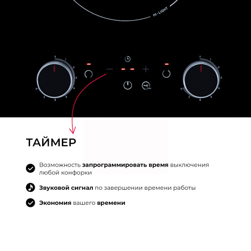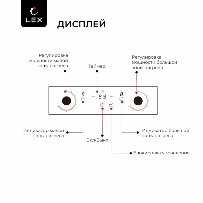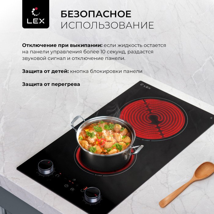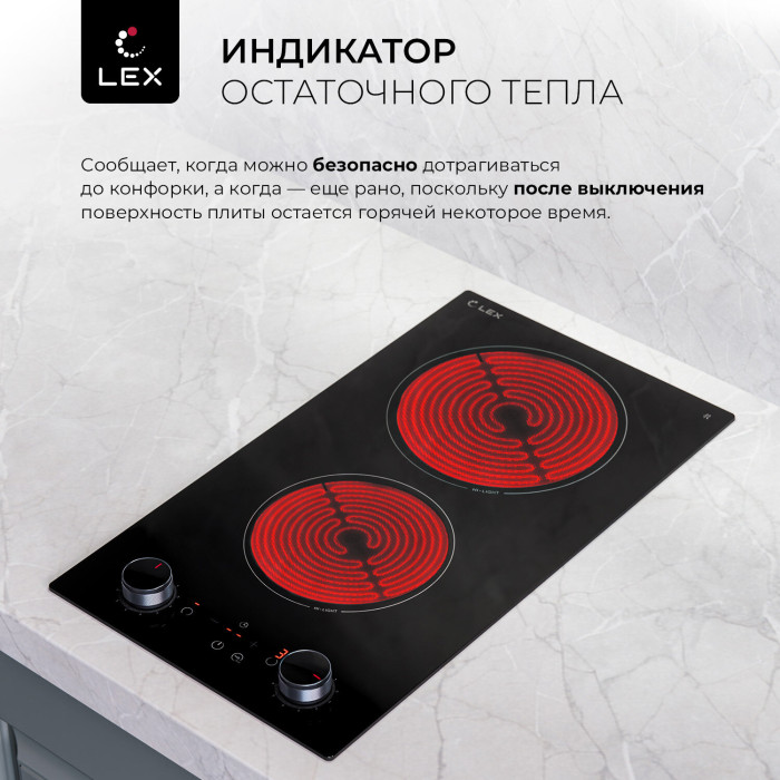 защитное отключение конфорок, индикатор остаточного тепла, кнопка блокировки панели