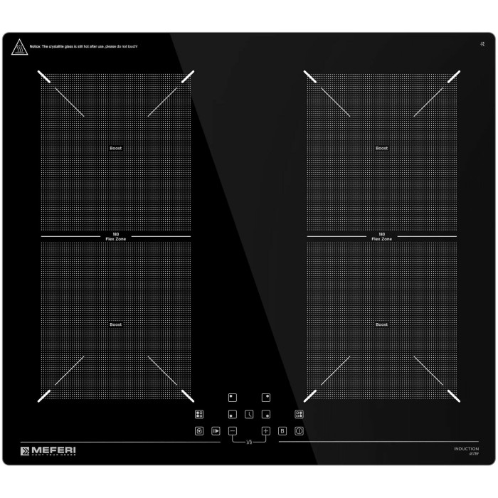 защитное отключение конфорок, индикатор остаточного тепла, кнопка блокировки панели