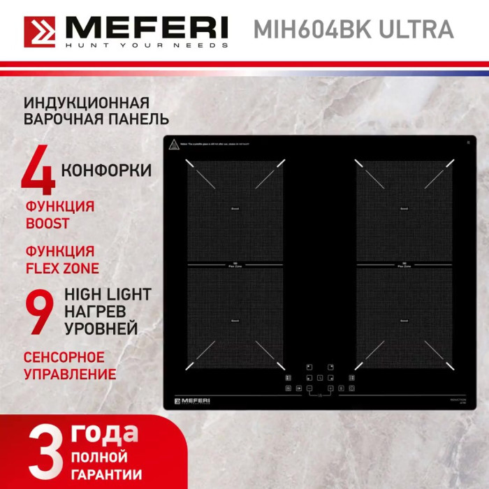 варочная панель; комплект монтажа; инструкция на русском языке; гарантийный талон на 3 года.