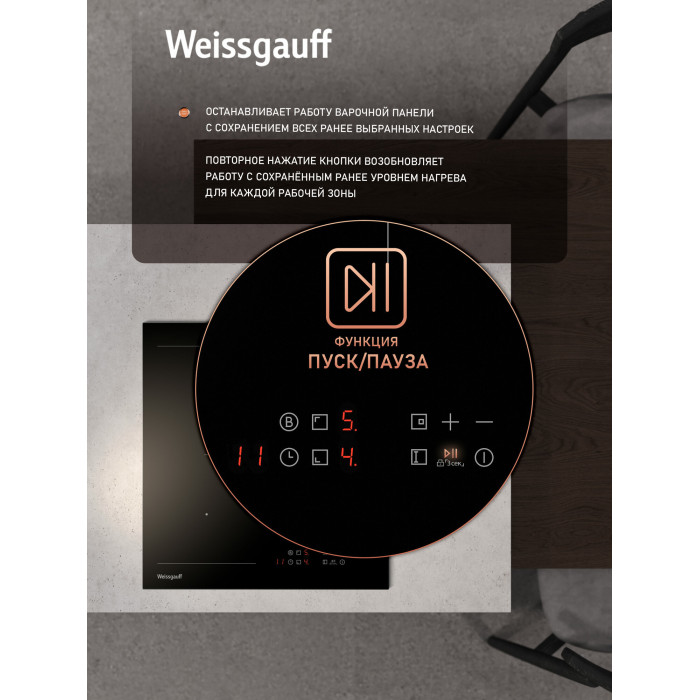 защитное отключение конфорок, индикатор остаточного тепла, кнопка блокировки панели
